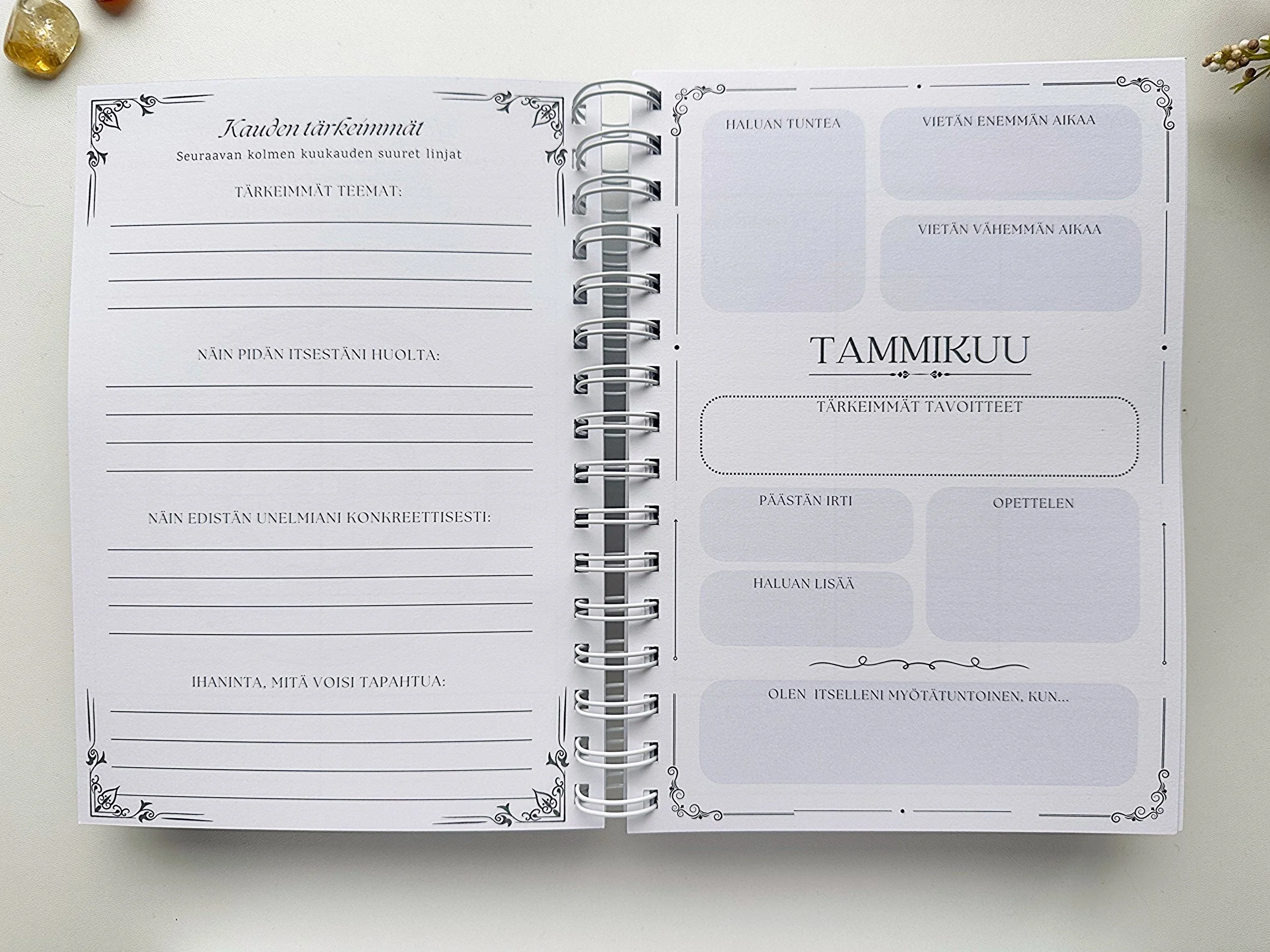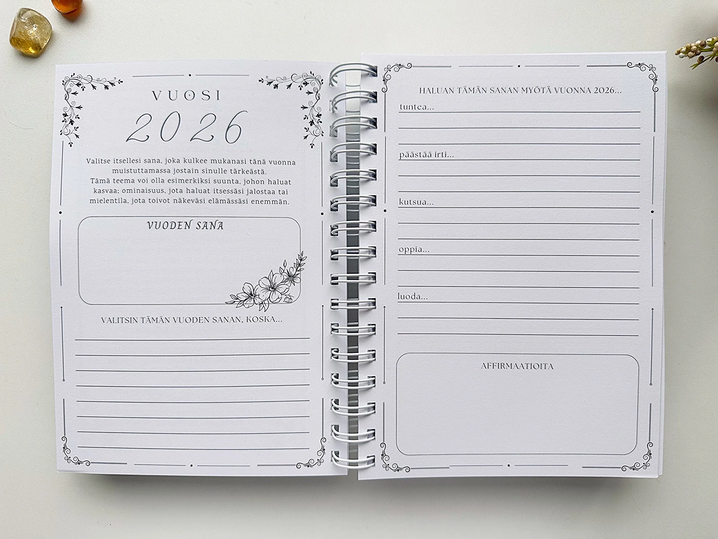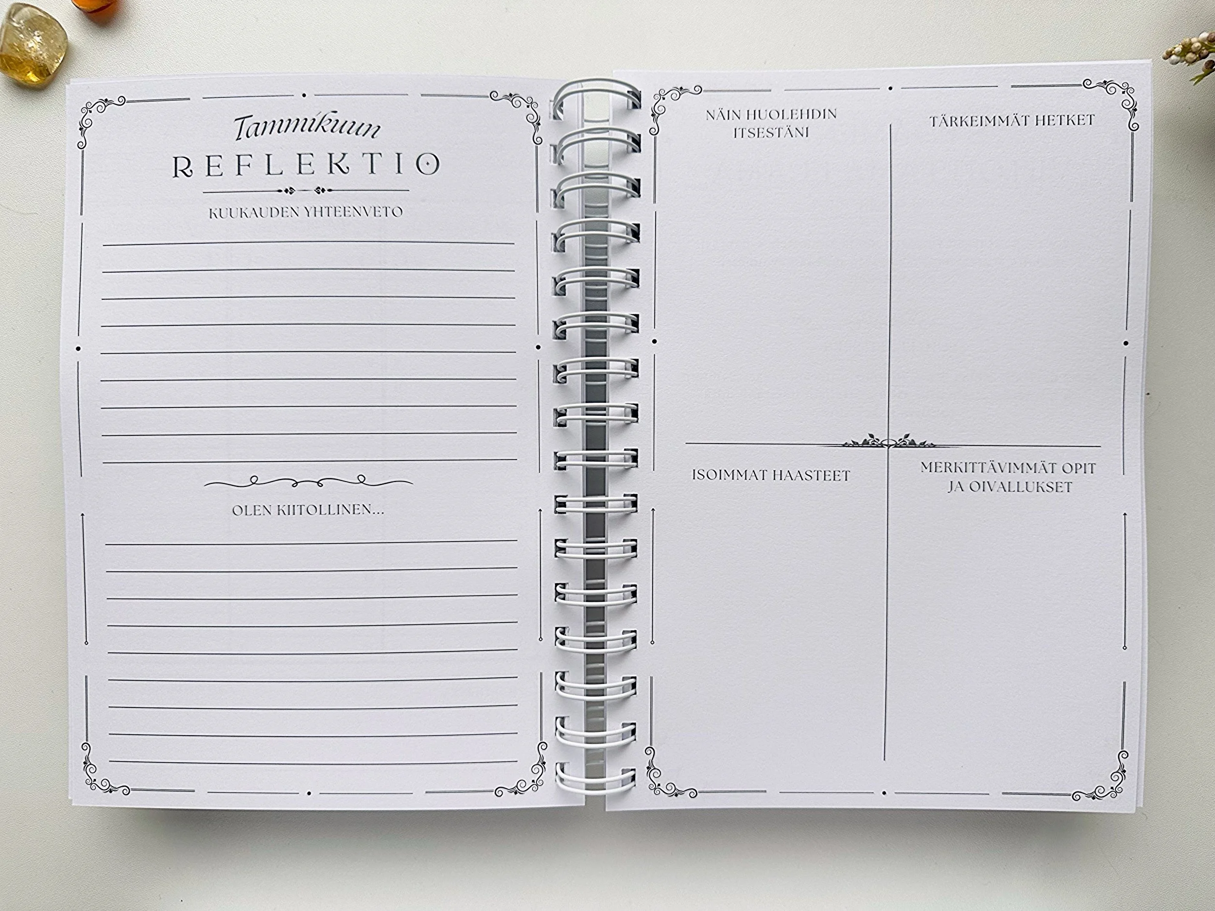 intentioiden asettamisen ja reflektoinnin mahdollisuudet jokaiselle kuukaudelle sekä vuoden alussa ja lopussa